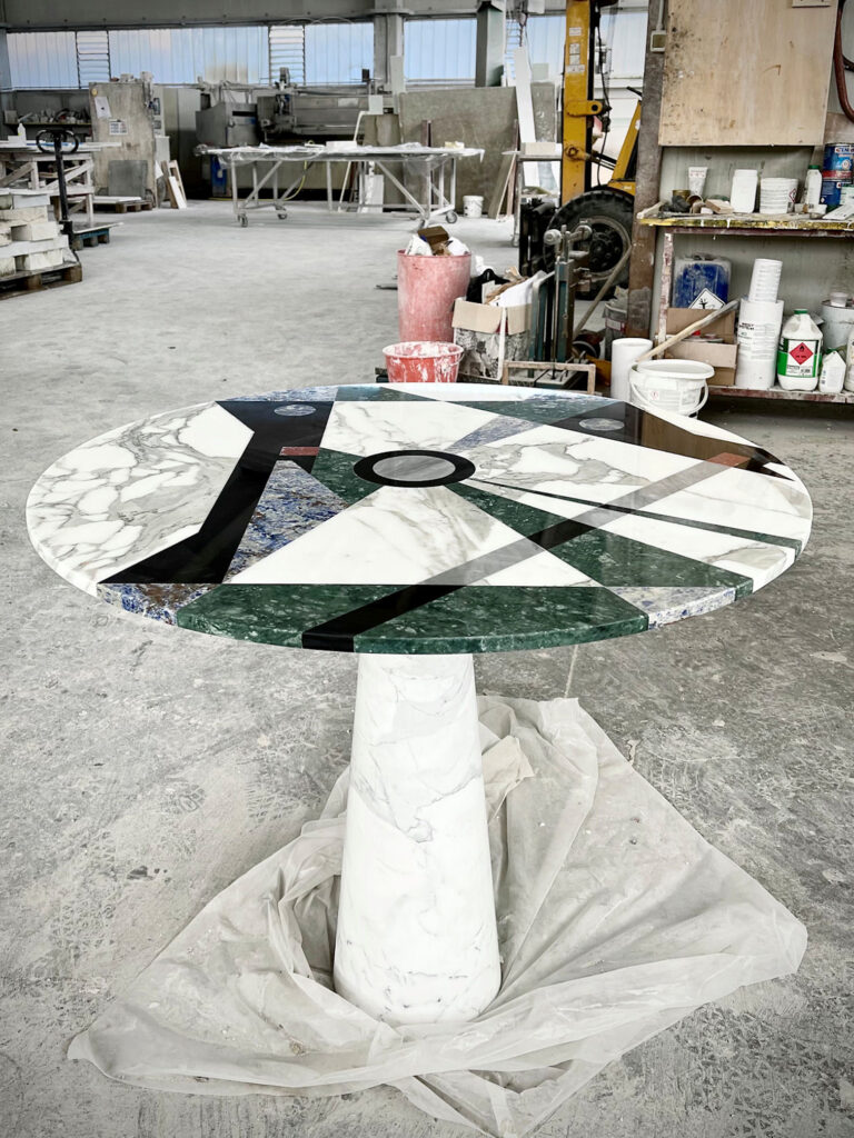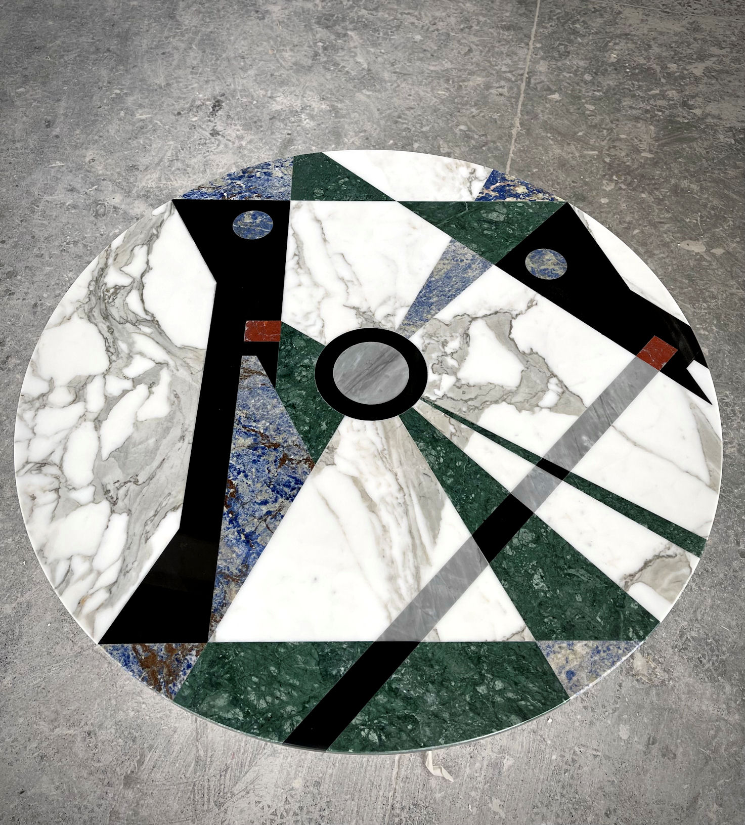 La costante ricerca stilistica e simbolica che caratterizza il lavoro della designer, si traduce nel progetto del tavolo PLUTO in un elaborato piano policromo, che si compone attraverso un particolare segno grafico. Il segno/disegno è la rappresentazione di una figura emersa dall’inconscio e legata ad energie di rinnovamento e trasformazione. Il nome rimanda al pianeta Plutone, che in astrologia rappresenta il potere rigenerativo e l’energia interiore. Tale figura, in marmo Nero Belgio, è generatrice dell’articolata geometria del piano del tavolo. In rapporto dialettico col piano policromo, un’unica gamba conica, in marmo Bianco venato, si erge nella sua forma pura.